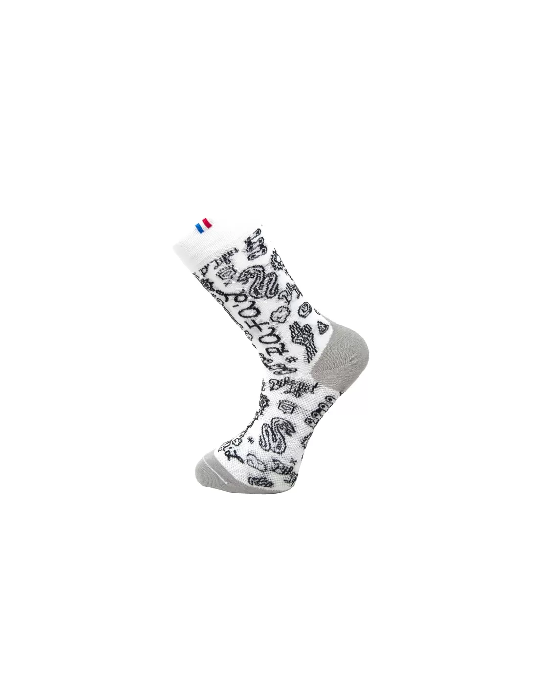 Gemaakt in Frankrijk, combineren deze sokken naadloos een ultraventilerend gaas dat de thermoregulatie van de voet vergemakkelijkt en vochtafvoer mogelijk maakt, samen met hiel- en teenversterkingen van Resistex, een koolstof-geïnfundeerde stof die opmerkelijke duurzaamheid, ademend vermogen, thermoregulatie en antibacteriële eigenschappen heeft.